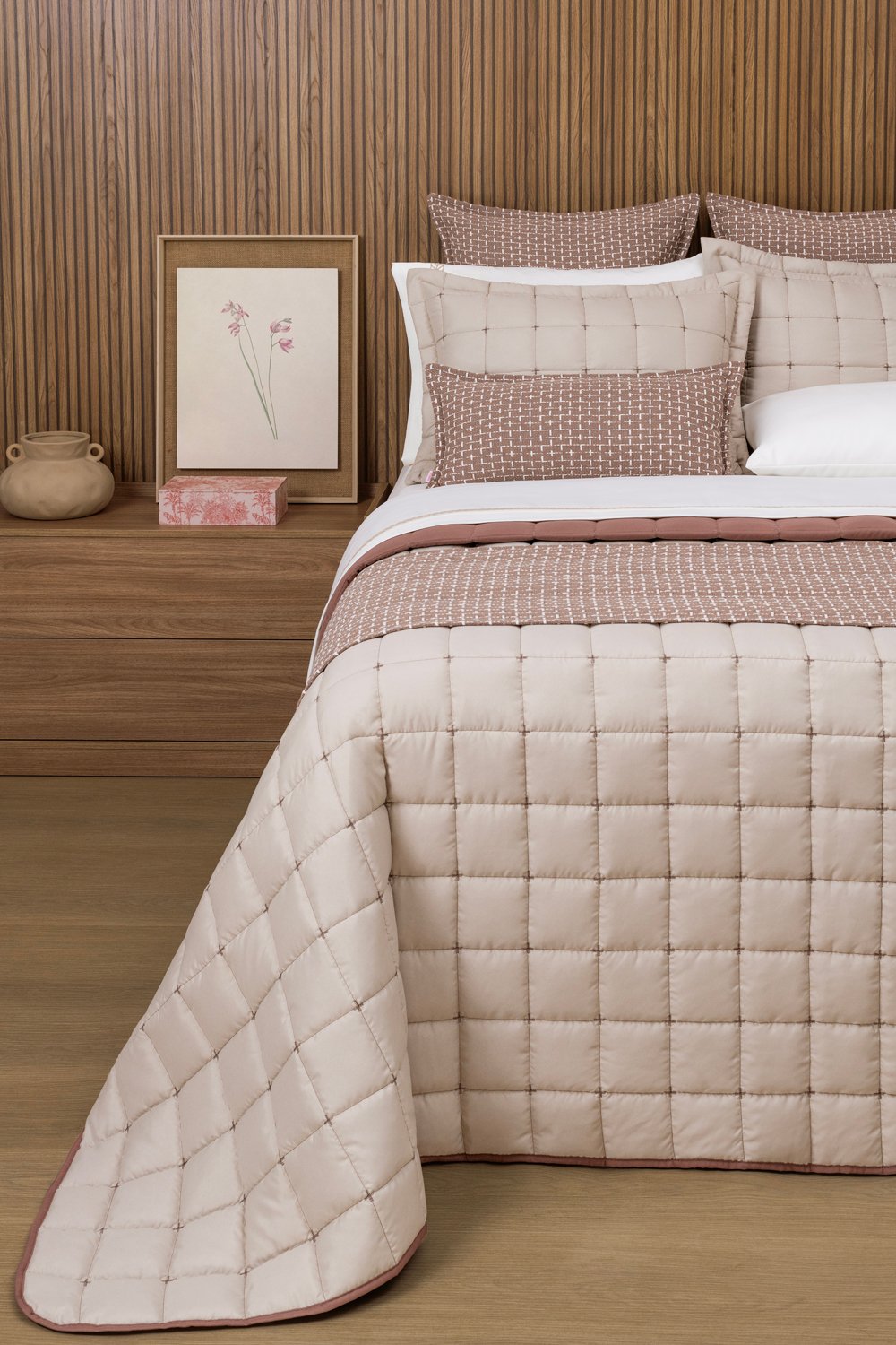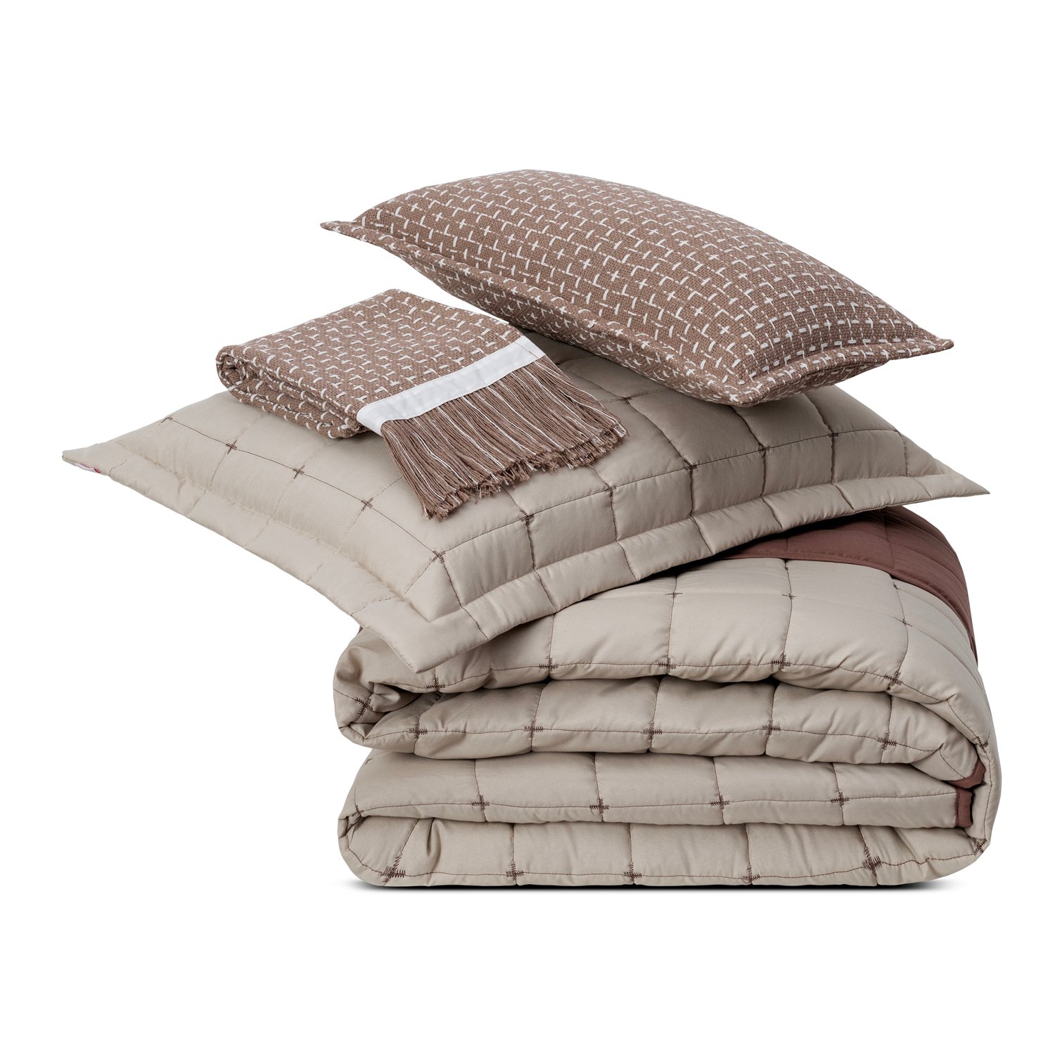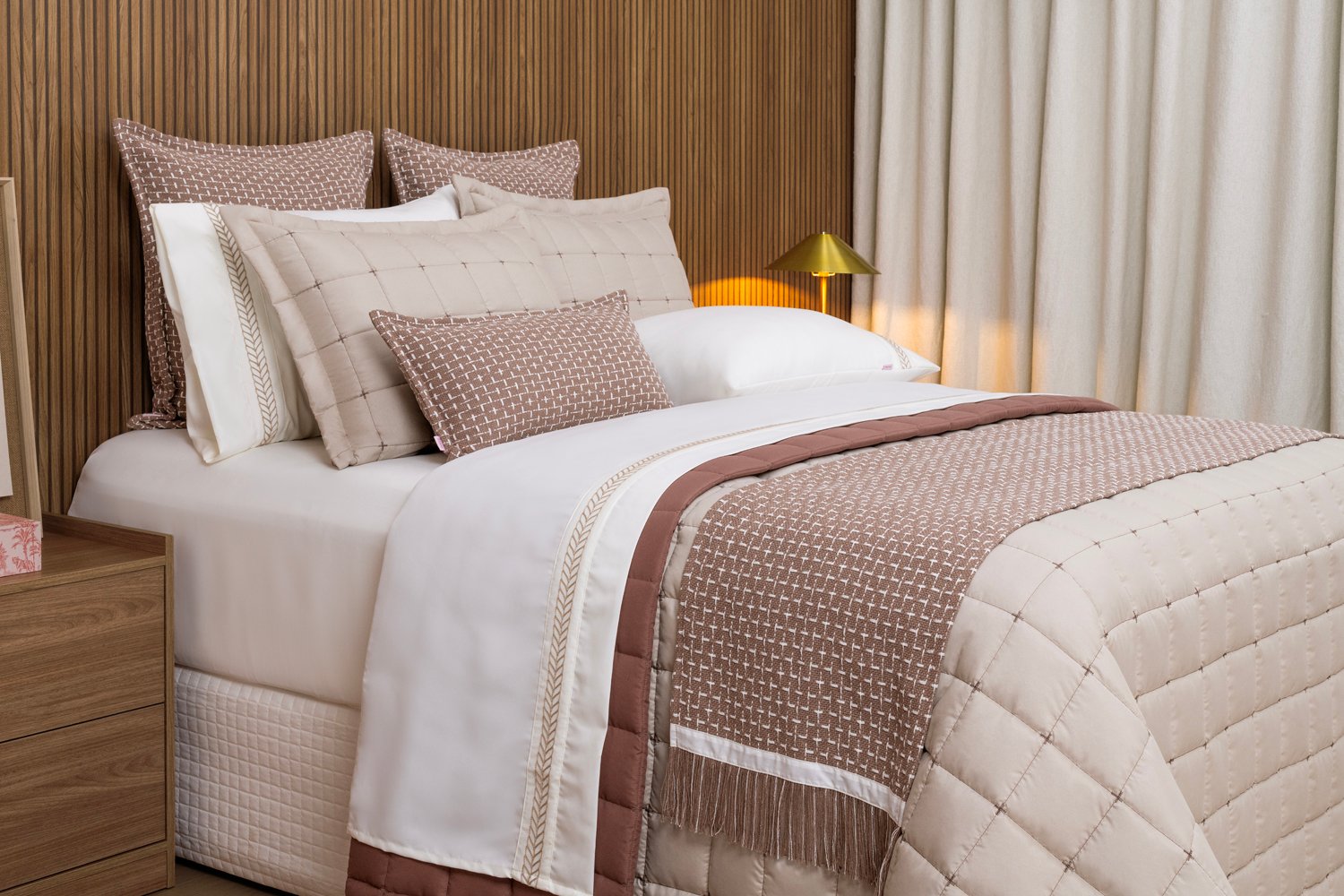 Os acessórios feitos em tear manual, 100% de algodão, trazem elegância e um toque de sensibilidade ao seu quarto.  A combinação de cores, tecidos e texturas remete ao bom gosto clássico que você procura.  E a quantidade de peças e acessórios é ideal para deixar sua cama cheia, com o aconchego que sua família merece.
