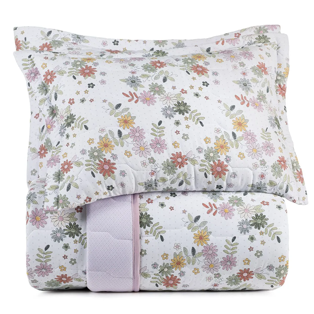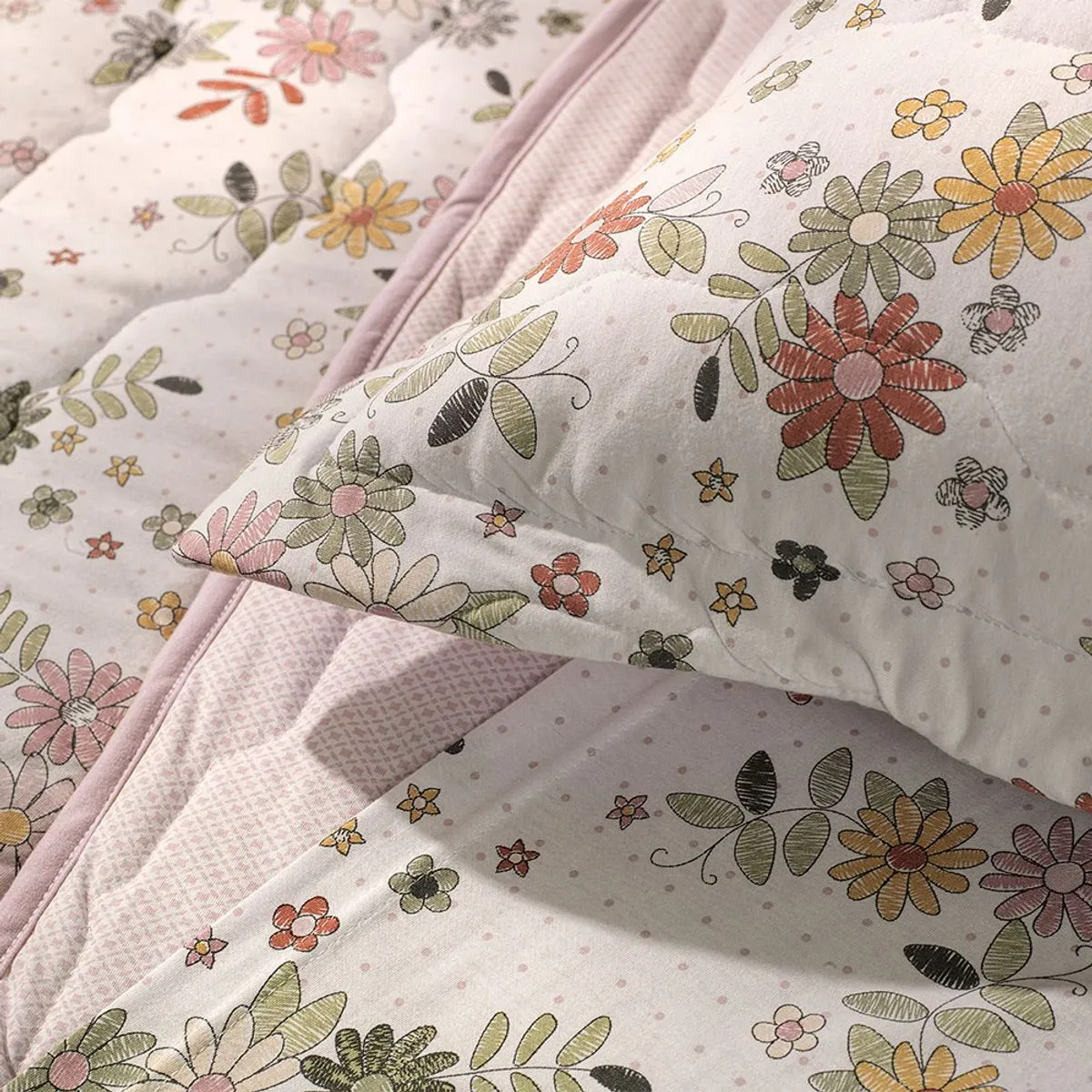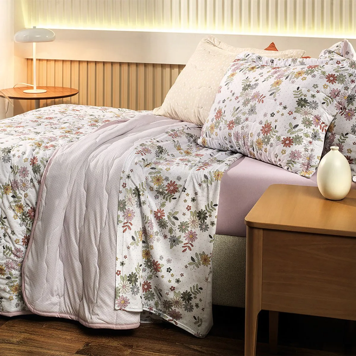 ESTAMPA FLORIR | A estampa Florir traz um charme delicado e atemporal, com um desenho singelo que alude a um bordado nostálgico e acolhedor. As flores distribuídas harmoniosamente sobre o fundo claro criam uma atmosfera suave e romântica, evocando a beleza dos trabalhos artesanais que remetem ao aconchego do lar. Em tons sutis e naturais, essa estampa é perfeita para quem deseja um toque de leveza e elegância na decoração do quarto. O Jogo de Colcha é ideal para quem busca sofisticação e conforto na decoração do quarto. Confeccionado em 100% algodão com acabamento em viés, o conjunto inclui uma colcha leve e um porta-travesseiro no tamanho 50cm x 70cm, com 3 abas de 4cm, garantindo um acabamento impecável. Seu enchimento de poliéster thermobonder 90g/m², proporciona um caimento suave e confortável para o dia a dia.