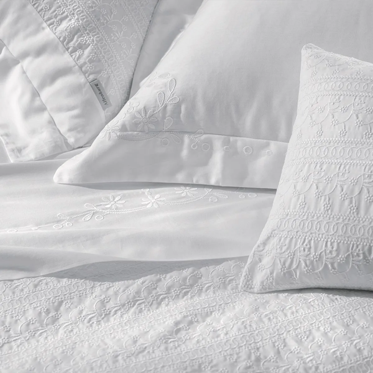 Confeccionado com o mais puro cetim de 300 fios, esta colcha oferece uma sensação de maciez excepcional, envolvendo-o em um abraço de conforto durante as noites de sono. Os bordados meticulosamente elaborados adicionam um toque de sofisticação artesanal, conferindo um charme único a cada detalhe.