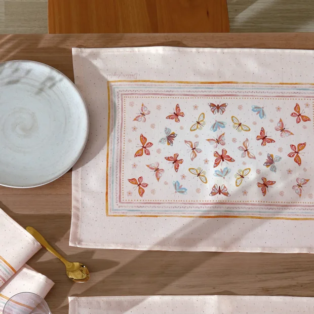 O modelo Serena possui estampa de borboletas em tons de rosa clarinho, delicada e versátil deixa sua mesa posta ainda mais sofisticada, dando aquele toque especial para todas as refeições além de proteger sua toalha. Com nova tecnologia de estamparia digital (eco-responsável), a linha Renova possui estampas com desenhos ainda mais vívidos e ricos em detalhes.
