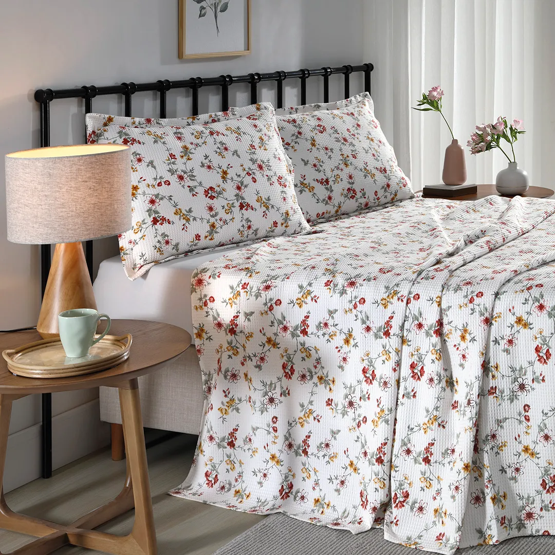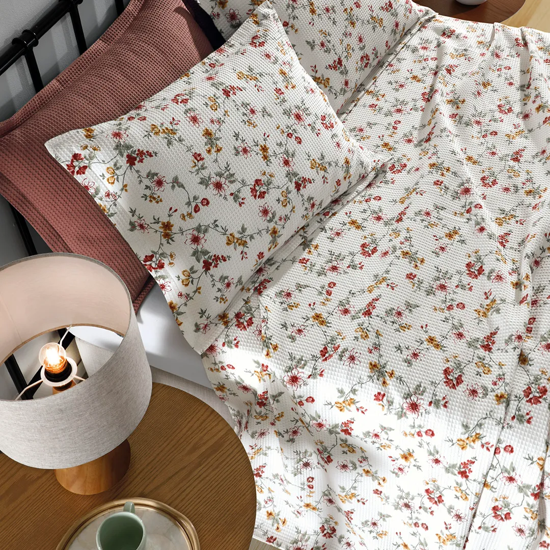 O padrão floral com cores quentes é para aqueles que buscam levar graciosidade e leveza ao seu quarto, sem deixar de lado a qualidade do produto.