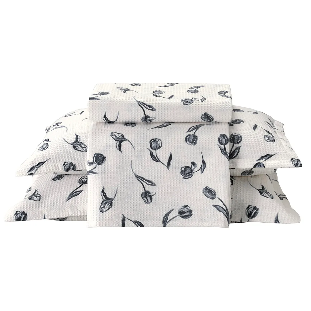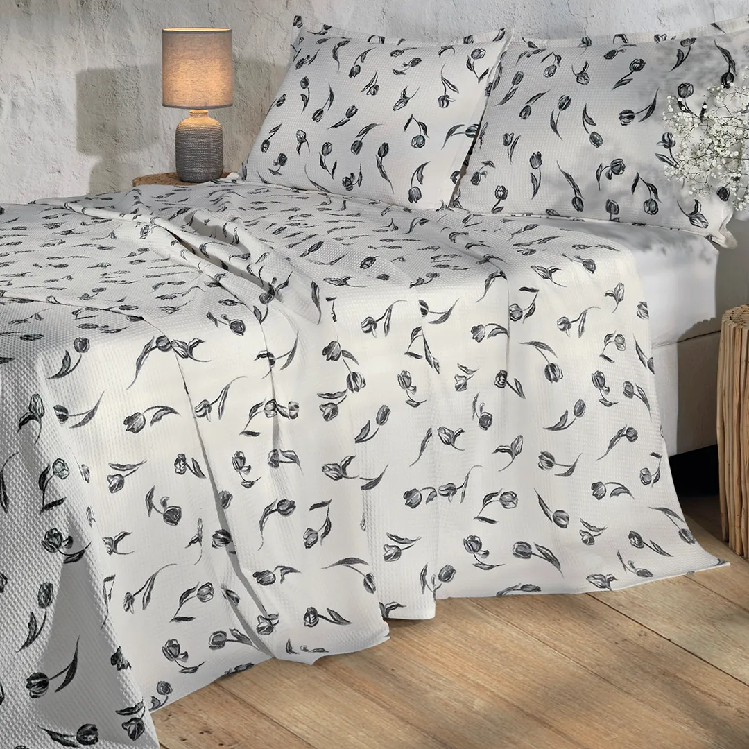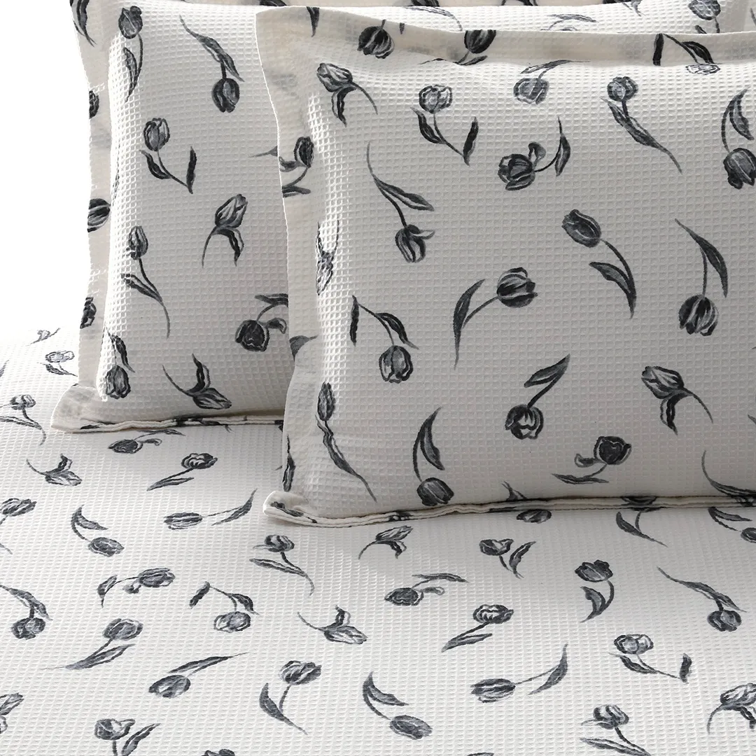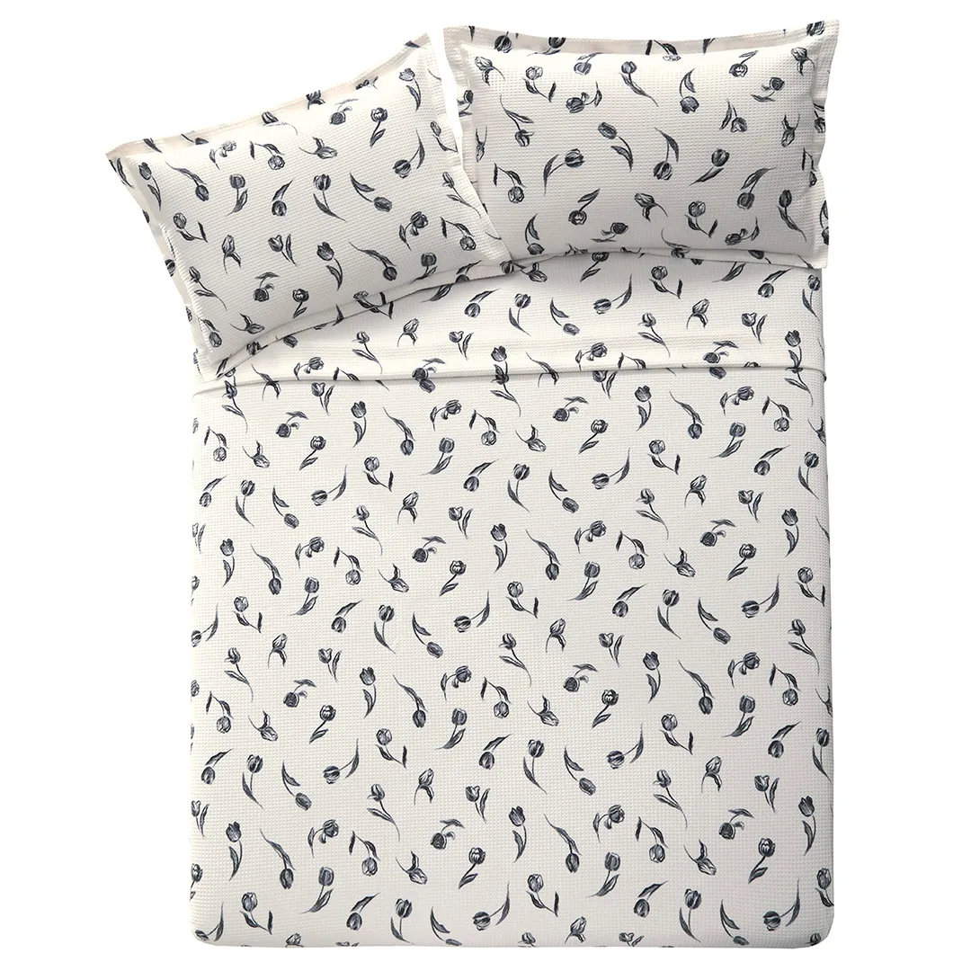 O principal diferencial deste modelo está no tecido em piquet favo, que traz uma textura singular e sofisticada ao produto com o relevo que imita favos de mel. A estampa de desenhos delicados da flor tulipa na cor preta em fundo branco charmosa e romântica, ao mesmo tempo que é contemporânea. O modelo Tulipa trará leveza e encanto ao seu ambiente com seus detalhes elegantes.